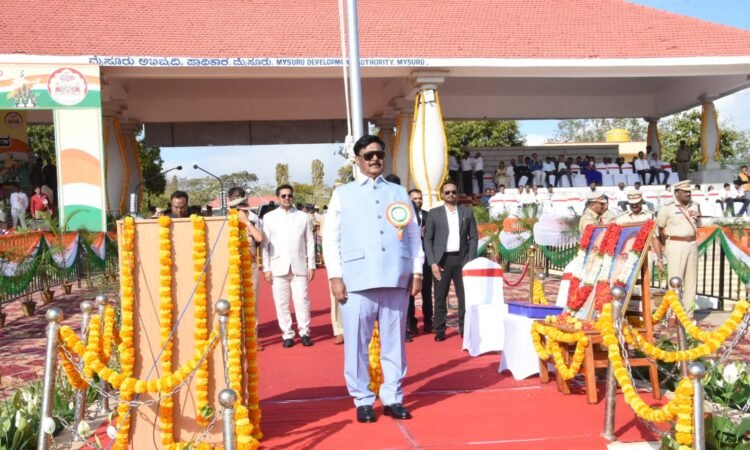 ಮೈಸೂರು ಜನವರಿ 26 :- 77 ನೇ ಗಣರಾಜ್ಯೋತವದ ಆಚರಣೆಯನ್ನು ನಗರದ ಪಂಜಿನ ಕವಾಯತು ಮೈದಾನದಲ್ಲಿ ಅದ್ದೂರಿಯಾಗಿ ಆಚರಣೆ ಮಾಡಲಾಯಿತು. ಜಿಲ್ಲಾ ಉಸ್ತುವಾರಿ ಸಚಿವರು ಹಾಗೂ ಸಮಾಜ ಕಲ್ಯಾಣ ಇಲಾಖೆಯ ಸಚಿವರಾದ ಡಾ ಹೆಚ್ ಸಿ ಮಹದೇವಪ್ಪ ಅವರು ಧ್ವಜಾರೋಹಣ ನೆರವರಿಸಿ ಚಾಲನೆ ನೀಡಿದರು.