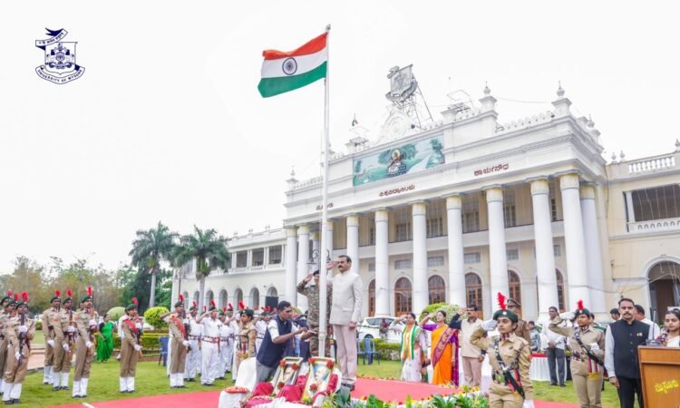 ಮೈಸೂರು 26 :- ಮೈಸೂರು ವಿಶ್ವವಿದ್ಯಾನಿಲಯದ ಕ್ರಾಫರ್ಡ ಭವನದಲ್ಲಿ ದಿನಾಂಕ:26-01-2026ರಂದು ಬೆಳಗ್ಗೆ 7.30 ಗಂಟೆಗೆ 77ನೇ ಗಣರಾಜೋತ್ಸವ ದಿನಾಚರಣೆಯನ್ನು ಮಾನ್ಯ ಕುಲಪತಿಗಳಾದ ಪ್ರೊ. ಎನ್. ಕೆ. ಲೋಕನಾಥ್ರವರು, ಎನ್.ಸಿ.ಸಿ. ಕೆಡಟ್ಗಳಿಂದ ಗೌರವ ವಂದನೆ ಸ್ವೀಕರಿಸಿ, ಧ್ವಜಾರೋಹಣ ನೆರವೇರಿಸಿದರು. ಈ ಸಂದರ್ಭದಲ್ಲಿ ಲಲಿತಕಲಾ ಕಾಲೇಜು, ಯುವರಾಜ ಕಾಲೇಜು ಮಹಾರಾಜ ಕಾಲೇಜಿನ ವಿದ್ಯಾರ್ಥಿಗಳು ದೇಶ ಭಕ್ತಿಗೀತೆ ಮತ್ತು ನಾಡಗೀತೆಗಳನ್ನು ಹಾಡಿದರು. ಮಾನ್ಯ ಕುಲಪತಿಗಳು ಮಾತನಾಡುತ್ತಾ ಪ್ರತಿ ವರ್ಷ ಸಂಭ್ರಮದಿಂದ ಆಚರಿಸಲಾಗುವ ಗಣರಾಜ್ಯೋತ್ಸವವು, 1950ರ ಜನವರಿ 26 ರಂದು ಭಾರತೀಯ ಸಂವಿಧಾನದ ಐತಿಹಾಸಿಕ ಅಂಗೀಕಾರವನ್ನು ಸೂಚಿಸುತ್ತದೆ. ಗಣರಾಜ್ಯೋತ್ಸವವು ನ್ಯಾಯ, ಸ್ವಾತಂತ್ತ್ಯಯ, ಸಮಾನತೆ ಮತ್ತು ಭ್ರಾತೃತ್ವದ ಮೂಲ ಮೌಲ್ಯಗಳ ದ್ಯೋತಕವಾಗಿದೆ, ಗಣರಾಜ್ಯೋತ್ಸವವು ನಾಗರೀಕರಿಗೆ ಅವರ ಹಕ್ಕುಗಳ ಜೊತೆಗೆ ಅವರ ಕರ್ತವ್ಯಗಳನ್ನು ನೆನಪಿಸುತ್ತದೆ. ಭಾರತೀಯ ಸಂವಿಧಾನವು ಈ ದೇಶದ ವಿಶಾಲ ವೈವಿಧ್ಯತೆಗೆ, ಏಕೀಕೃತ ಚೌಕಟ್ಟನ್ನು ಒದಗಿಸುತ್ತದೆ.