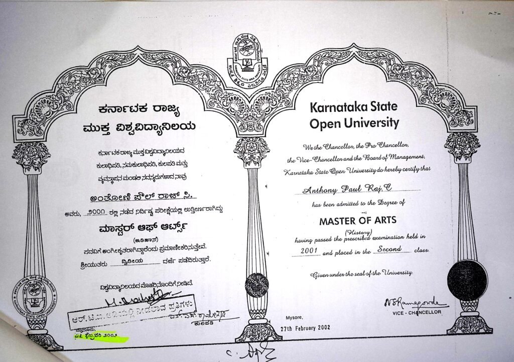 ಇದೇ ವೇಳೆ ಆಂತೋಣಿ ಪೌಲ್ ರಾಜ್ ಅವರು ಸಲ್ಲಿಸಿದ ಸೇವಾ ದಾಖಲೆ ವಿವರಗಳ ಪ್ರಕಾರ 2005ರಿಂದ 2018ರವರೆಗೆ ಸೆಂಟ್ ಜೋಸೆಫ್ ಬಿ.ಎಡ್ ಕಾಲೇಜಿನಲ್ಲಿ ಸೇವೆ ಸಲ್ಲಿಸಿದ್ದಾಗಿ ಉಲ್ಲೇಖಿಸಲಾಗಿದೆ. ಈ ನಡುವೆಯೇ ಅವರು ಪಡೆದಿರುವ ಪಿ.ಹೆಚ್‌.ಡಿ ಪದವಿಯ ಕುರಿತೂ ಅನುಮಾನಗಳು ವ್ಯಕ್ತವಾಗಿವೆ. ಅವರು ಮೆಘಾಲಯದ ಸಿ.ಎಂ.ಜೆ ವಿಶ್ವವಿದ್ಯಾನಿಲಯದಿಂದ ಪಿ.ಹೆಚ್‌.ಡಿ ಪಡೆದಿರುವುದಾಗಿ ತಿಳಿದುಬಂದಿದ್ದು, ಕೋರ್ಸ್ ವರ್ಕ್ ಅಂಕಪಟ್ಟಿಯಲ್ಲಿ ಮುದ್ರಣ ದೋಷಗಳು ಕಂಡುಬಂದಿರುವುದು ಹಾಗೂ ಪ್ರಾವಿಜನಲ್ ಪ್ರಮಾಣಪತ್ರ ಕೈಬರಹದಲ್ಲಿ ಇರುವುದರಿಂದ ದಾಖಲೆಗಳ ವಿಶ್ವಾಸಾರ್ಹತೆ ಕುರಿತು ಪ್ರಶ್ನೆಗಳು ಎದ್ದಿವೆ. ಜೊತೆಗೆ ಪಿ.ಹೆಚ್‌.ಡಿ ದಾಖಲೆಗಳಲ್ಲಿ ಉಲ್ಲೇಖಿತ ಹೆಸರು ಮತ್ತು ಹಿಂದಿನ ಅಂಕಪಟ್ಟಿಗಳಲ್ಲಿನ ಹೆಸರಿನ ವ್ಯತ್ಯಾಸವೂ ಗಮನ ಸೆಳೆದಿದೆ.